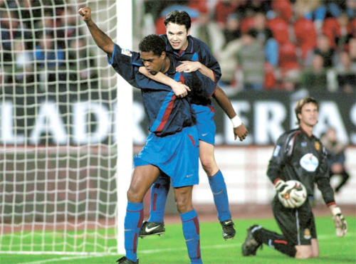 Iniesta và đàn anh Kluivert trong trận ra mắt La Liga